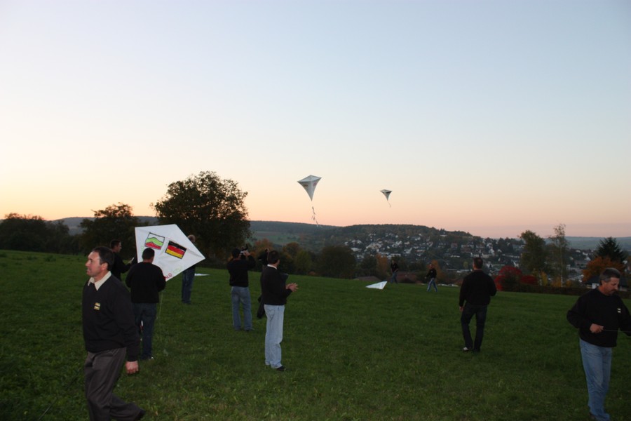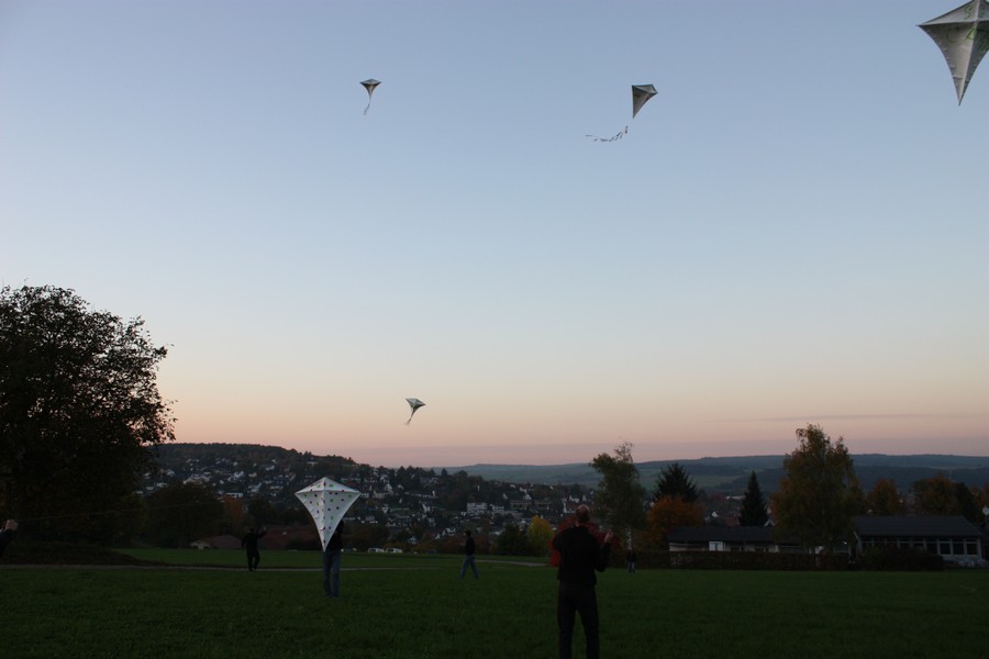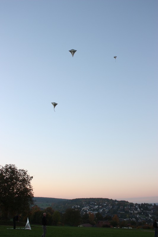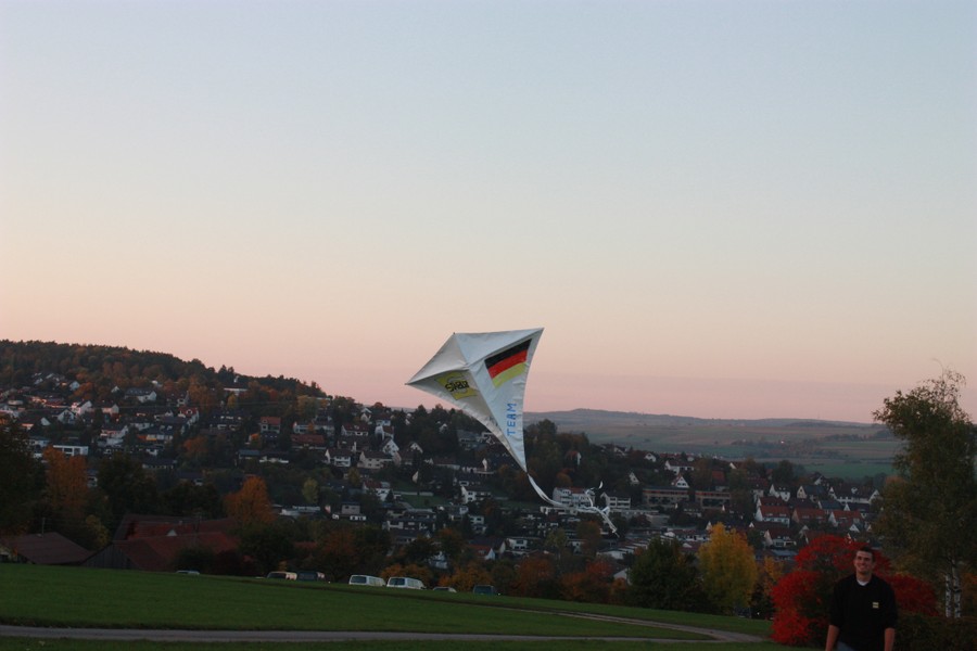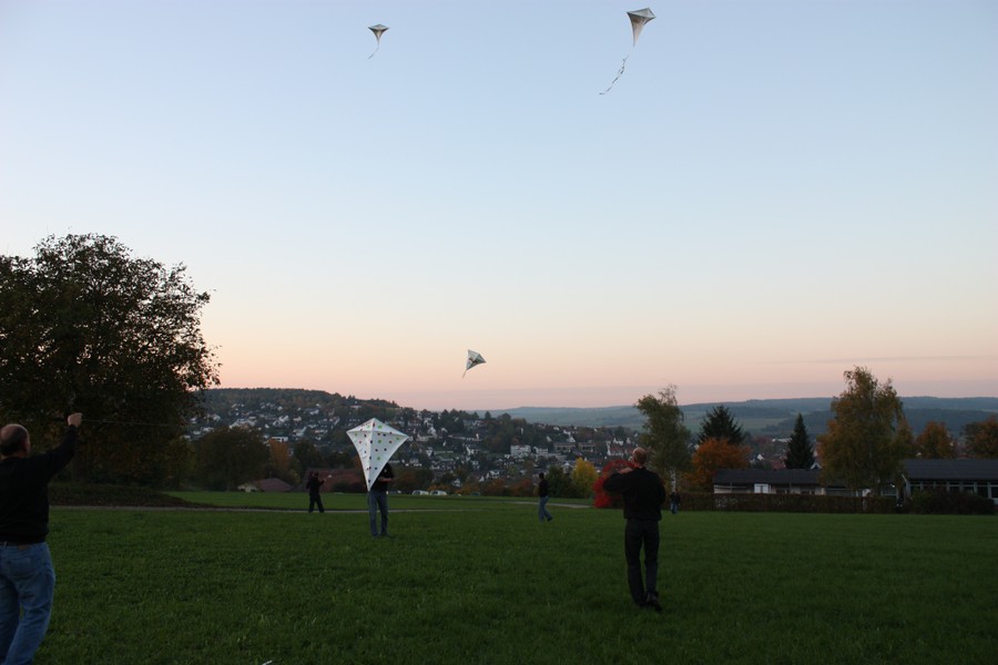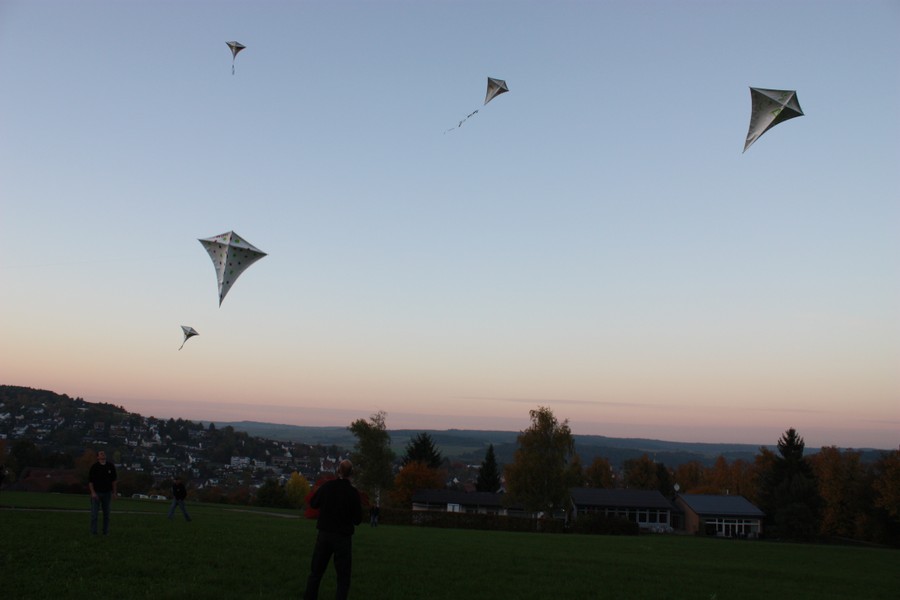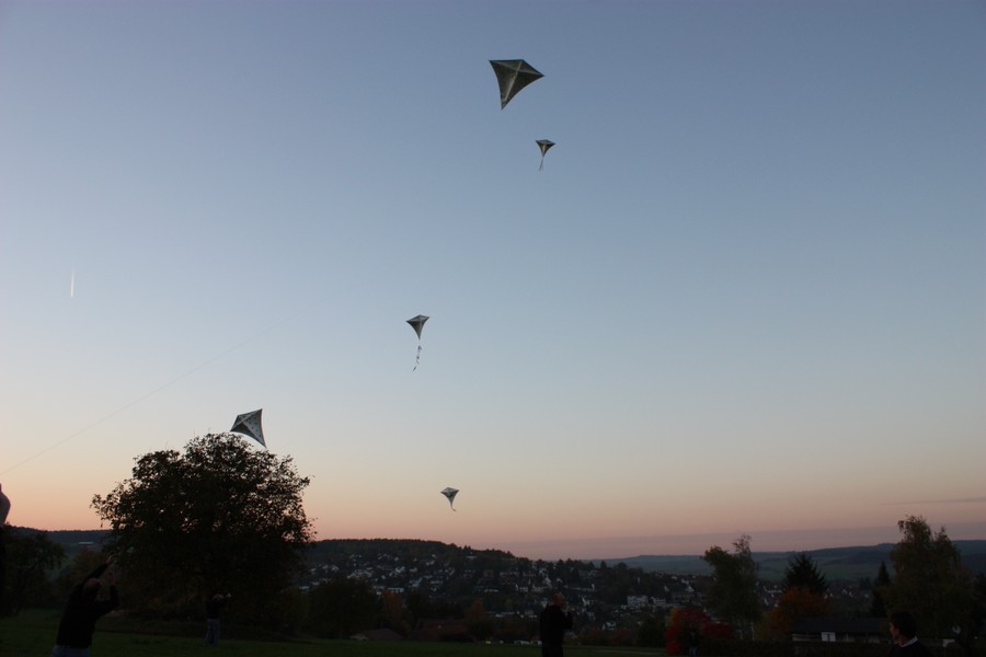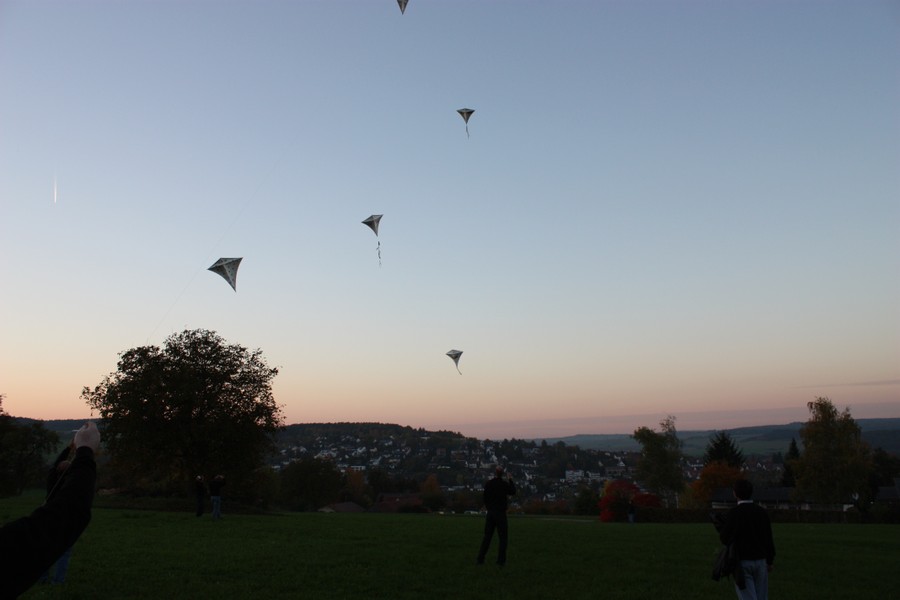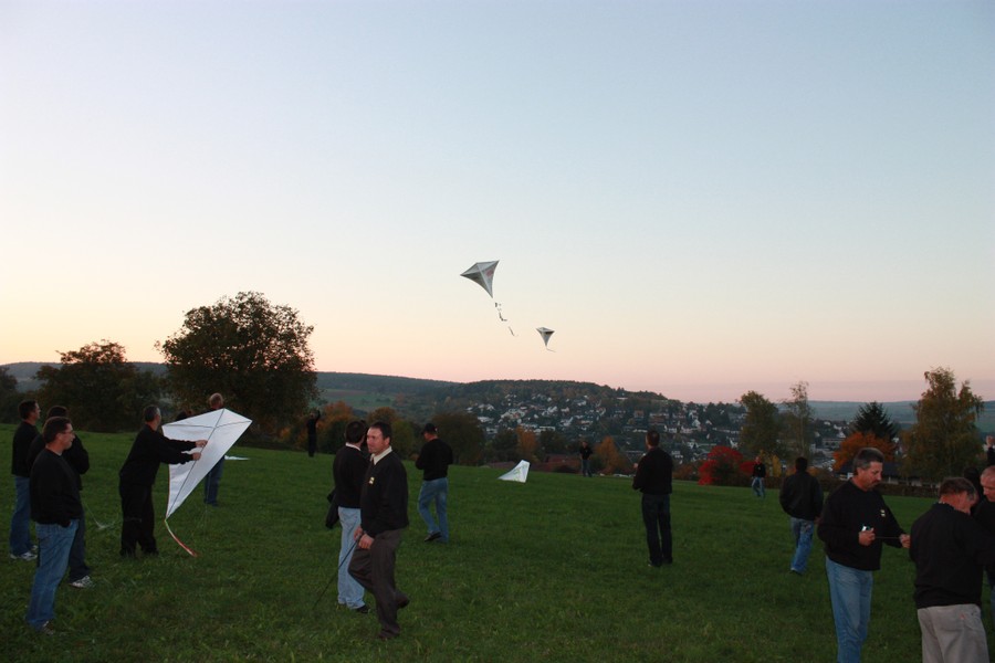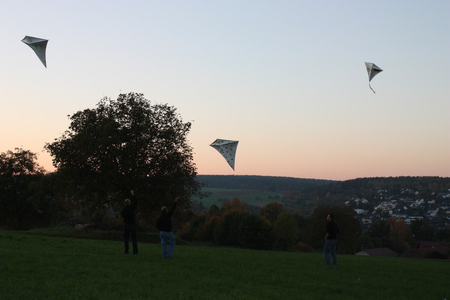 Drachenbauen bei Firma StäblerAuf Anfrage der Bauunternehmung Stäbler in Weil der Stadt bauten wir in Gruppen über 14 Eddy's und konnten am Abend diese vor einem herrlichen Sonnenuntergang fliegen lassen
